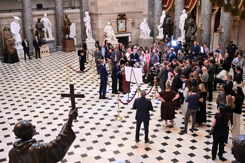 Nevin Al Sukari - Sana'a - Journalists look on as Speaker of the House Mike Johnson, Republican from Louisiana, and Senate Majority Leader John Thune, Republican from South Dakota, hold a press conference in Statuary Hall at the US Capitol on the third day of the US government shutdown in Washington, DC, on October 3, 2025. — AFP pic