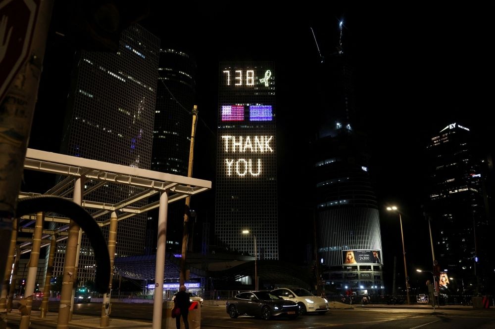 Nevin Al Sukari - Sana'a - The facade of a building displays a ‘Thank You’ message with the US and Israeli flags, as people gather at ‘Hostages Square’ to await the expected return of Israeli hostages, who have been held in Gaza since the deadly October 7, 2023 attack by Hamas, as part of a prisoner-hostage swap and a ceasefire deal between Israel and Hamas, in Tel Aviv October 13, 2025. — Reuters pic