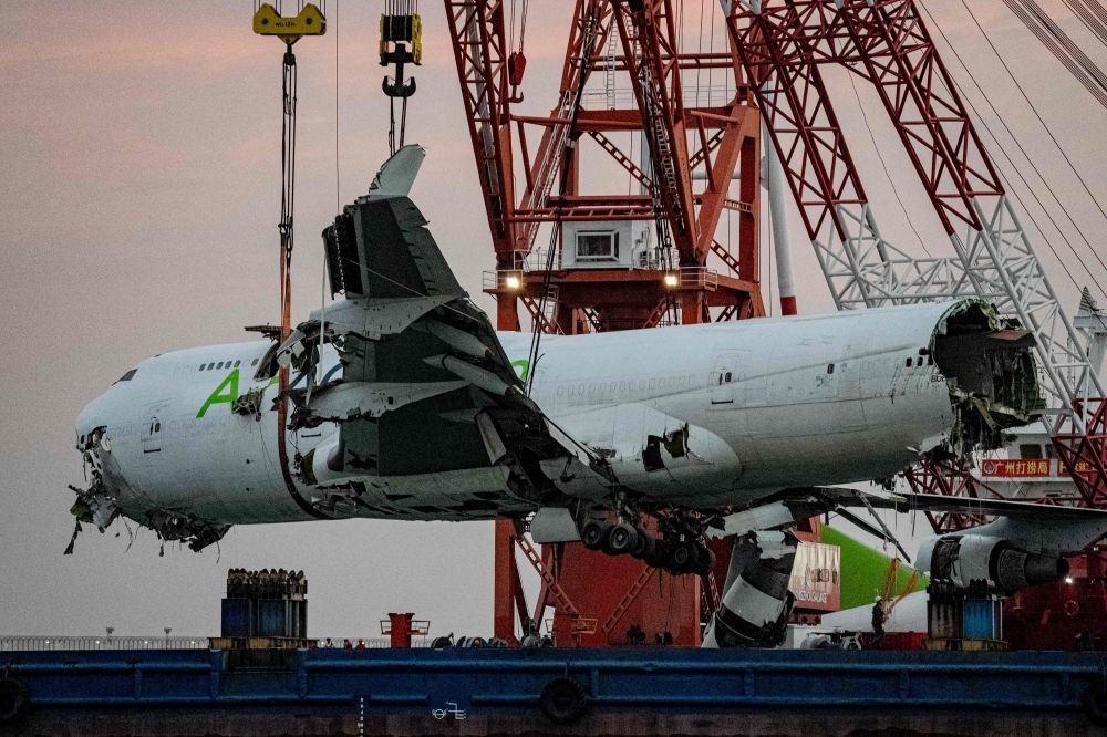 Nevin Al Sukari - Sana'a - The main fuselage section of an ACT Airlines Boeing 747-400 cargo aircraft, wet leased by Emirates SkyCargo, is hoisted out of the water in Hong Kong on October 26, 2025, after it veered off an airport runway on October 20 during landing, hitting a security patrol car and then skidding into the sea, leaving two men in the vehicle dead. — AFP pic