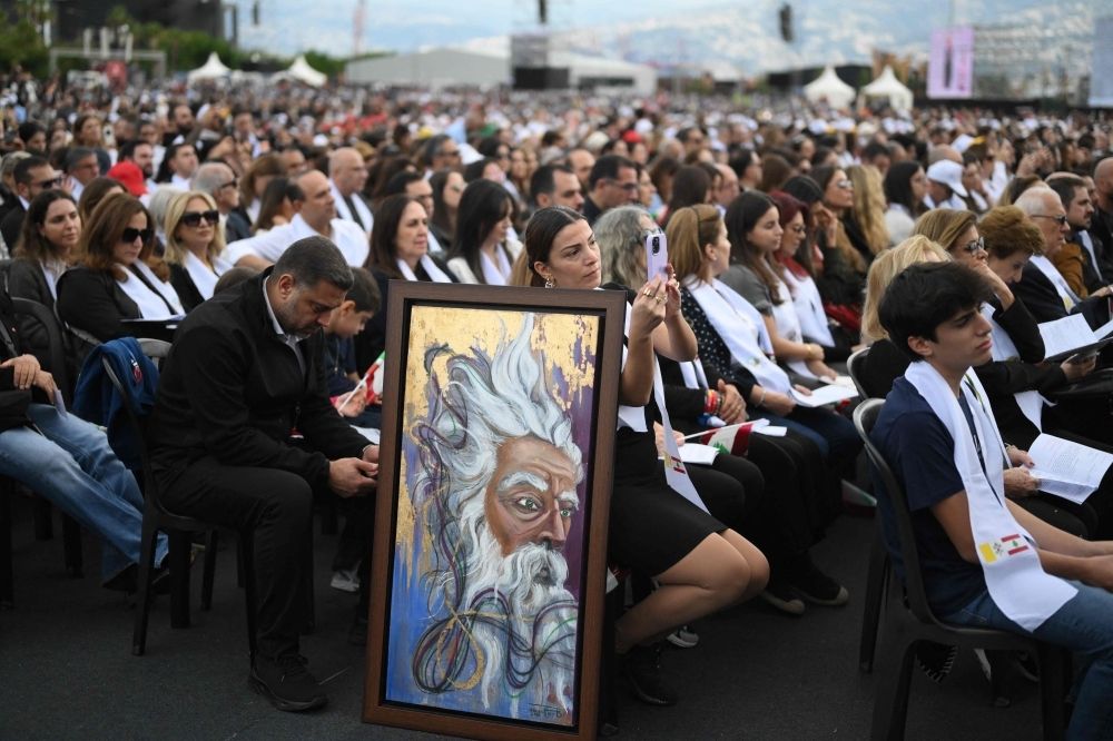 Arriving for the service on the last day of his trip, the pope wound his way through the crowd in his popemobile as people offered roses, with senior officials including President Joseph Aoun also in attendance.