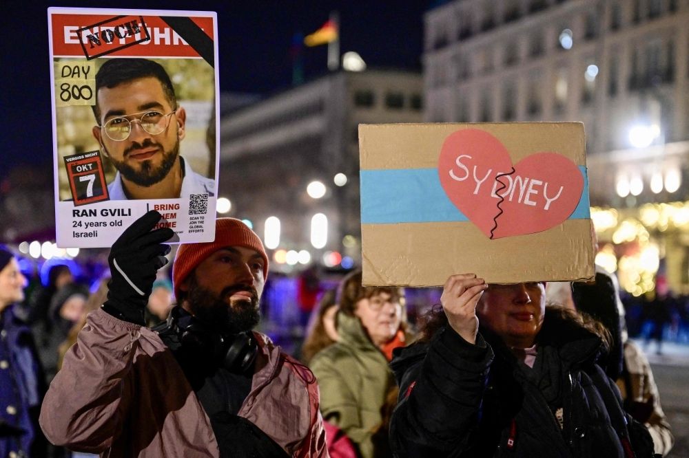 Nevin Al Sukari - Sana'a - People hold placards during a Hanukkah menorah lighting in Berlin, Germany on December 14, 2025, in solidarity with Australians after the Bondi Beach shooting. — AFP pic