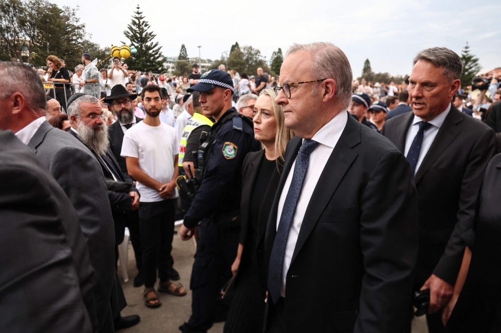 Tens of thousands, including Prime Minister Anthony Albanese and other leaders, attended a memorial event at Bondi Beach under a heavy police presence including snipers on rooftops and police boats in the waters.
