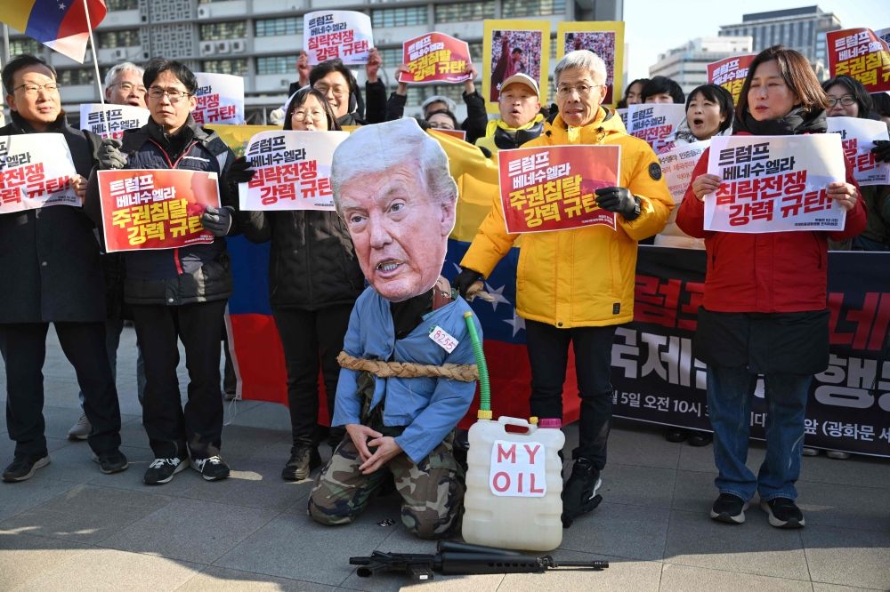 Protesters hold placards during a demonstration condemning the US attack on Venezuela and the seizure of Venezuelan leader Nicolas Maduro in front of the US embassy in Seoul on January 5, 2026. — AFP pic