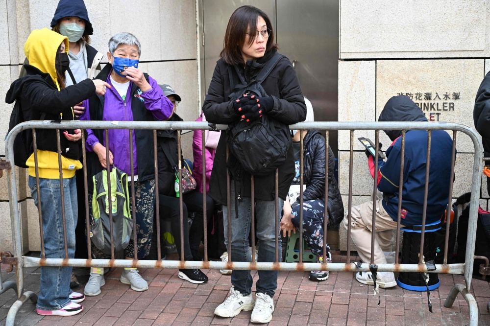 People queue outside the West Kowloon Magistrates' court in Hong Kong on January 12, 2026, for the sentencing arguments of convicted pro-democracy media tycoon Jimmy Lai. — AFP pic