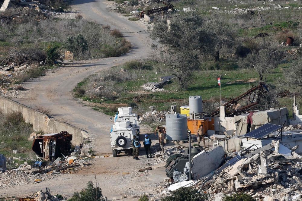 This picture taken from a position in northern Israel, on the border with southern Lebanon shows UN peacekeepers with the United Nations Interim Force in Lebanon (UNIFIL) standing with Lebanese soldiers next to destroyed buildings and cars in the southern Lebanese village of Dhayra on January 8, 2026. — AFP pic