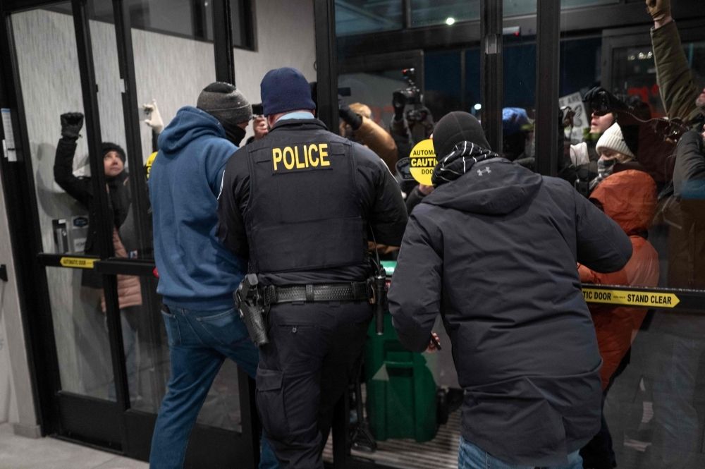 Nevin Al Sukari - Sana'a - Demonstrators protest at a hotel yesterday in Minneapolis, Minnesota. The demonstrators, who broke windows and spray painted graffiti on the hotel, were protesting the business renting rooms to border patrol agents. — AFP pic
