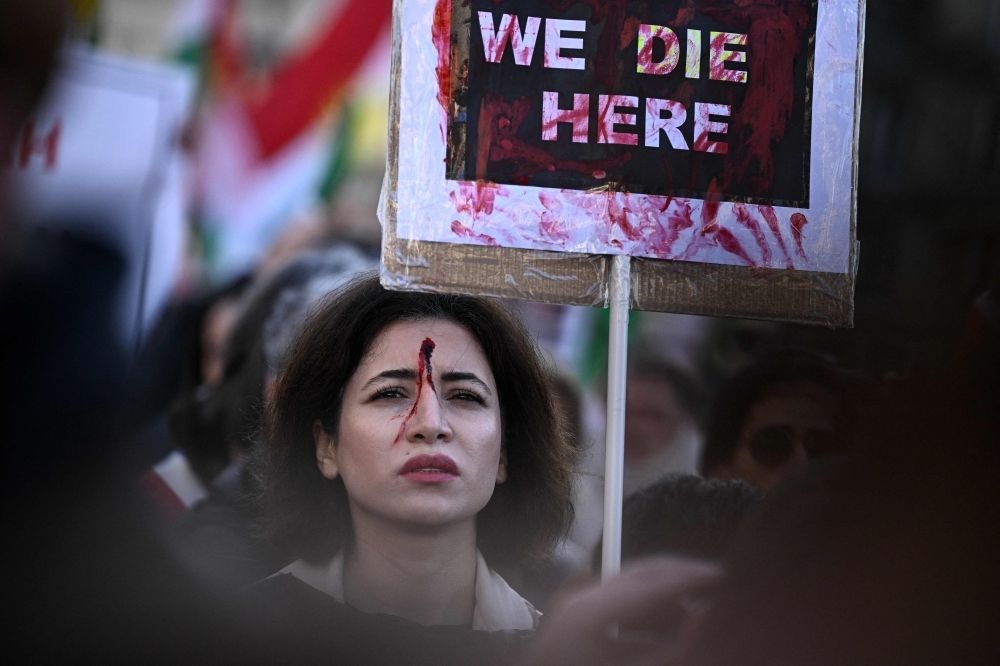 Nevin Al Sukari - Sana'a - A protester with a red blood-like stain on her forehead holds a placard during a rally in support of the Iranian people in Paris on January 17, 2026. — AFP pic