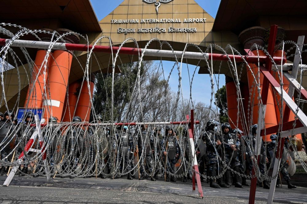 Security personnel stand guard behind barbed wire at the Tribhuwan International Airport before the arrival of Nepal’s former King Gyanendra Bir Bikram Shah Dev in Kathmandu on February 13, 2026. — AFP pic