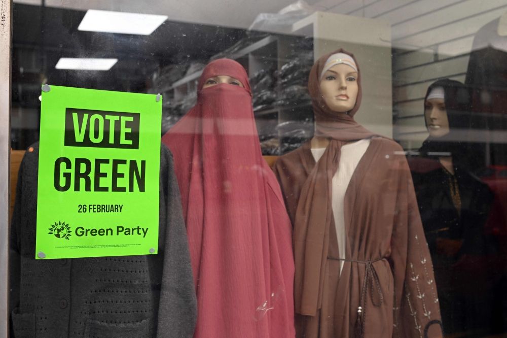 A poster promoting Britain's Green party is pictured in the window of a clothes retailer in Longsight, Greater Manchester on February 12, 2026, as parties begin to canvas voters ahead of the crucial Gorton and Denton by-election. — AFP pic