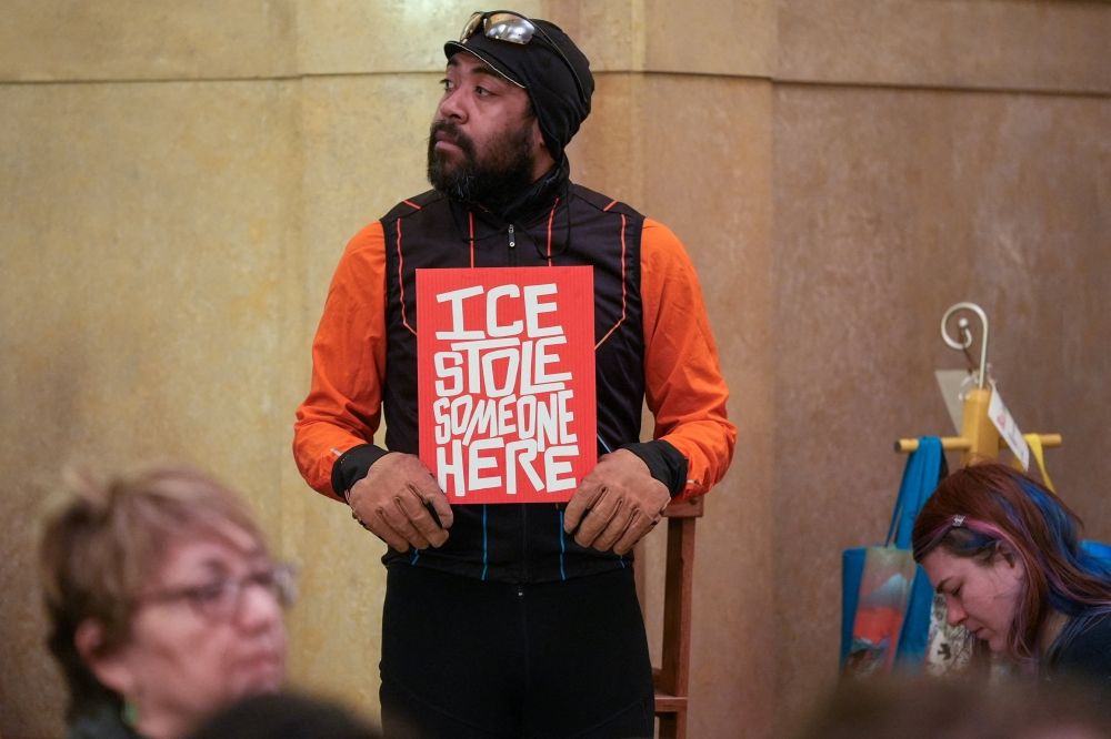 A man holds a placard as protesters gather during an event organised by Unidos MN at Christ Lutheran Church, near the State Capitol, in St. Paul, Minnesota February 26, 2026. — Reuters pic