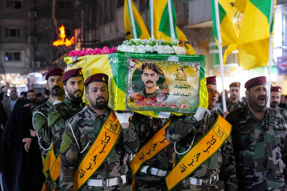 One of the caskets of two slain fighters from Iraq's pro-Iran paramilitary group Hezbollah Brigades (Kataeb Hezbollah), who were killed in a strike on their site in Baghdad's al-Jadriya area, is carried during their funeral at the shrine of Imam Ali in Iraq's central holy city of Najaf on March 14, 2026. — AFP pic