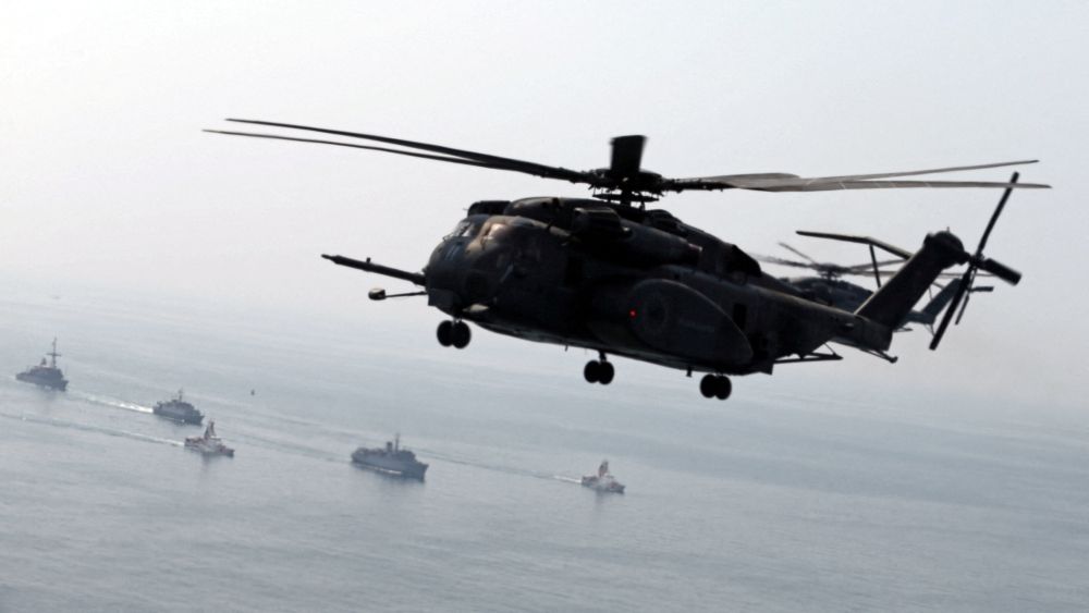 A U.S. Navy MH-53E Sea Dragon helicopter flies over U.S. and U.K. Navy ships during a Mine Countermeasures Exercise (MCMEX) in the Arabian Sea on September 10, 2018. — Reuters pic