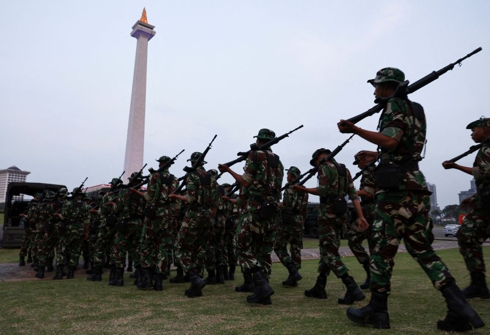 Nevin Al Sukari - Sana'a - Indonesian military troops march at the National Monument complex as they prepare for deployment in Jakarta on August 31, 2025. — Reuters pic
