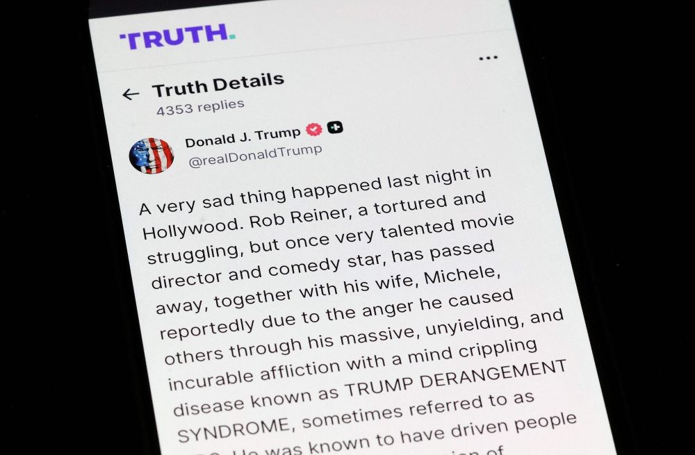 In this photo illustration, a phone shows US President Donald Trump’s Truth Social post on the death of actor and director Rob Reiner in Washington on December 15, 2025. — AFP pic