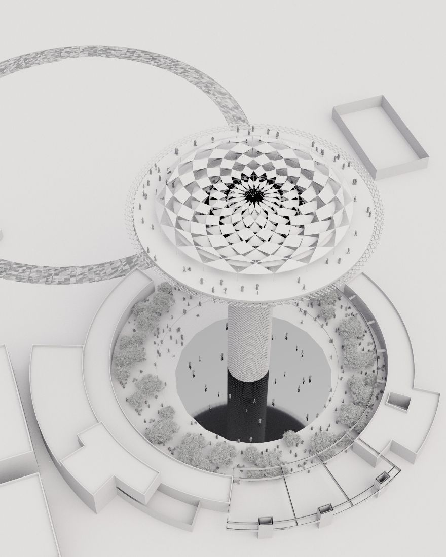 The design draws inspiration from the trunk of the date palm — a regional symbol — and the triangular patterns of Najdi architecture. The structure would become a bioclimatic facade, interacting with air, light, sound, and humidity to create a true sensorial ecosystem.